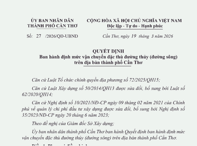 Ngày 19/3/2026, UBND thành phố Cần Thơ đã ký Quyết định số 27/2026/QĐ-UBND Ban hành định mức vận chuyển đặc thù đường thủy (đường sông) trên địa bàn thành phố Cần Thơ. Theo đó: