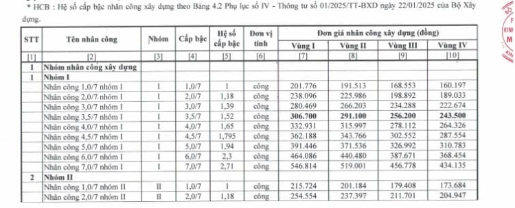 Ban hành kèm theo là phụ lục giá nhân công gồm 4 vùng: