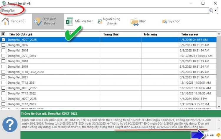- Hiện tại [DỰ TOÁN BNSC] đã cập nhật dữ liệu nội dung đơn giá nói trên, Khách hàng tải dữ liệu DongNai_XDCT_2025 trực tiếp trên phần mềm [TẢI DỮ LIỆU TỪ MÁY CHỦ] để sử dụng.