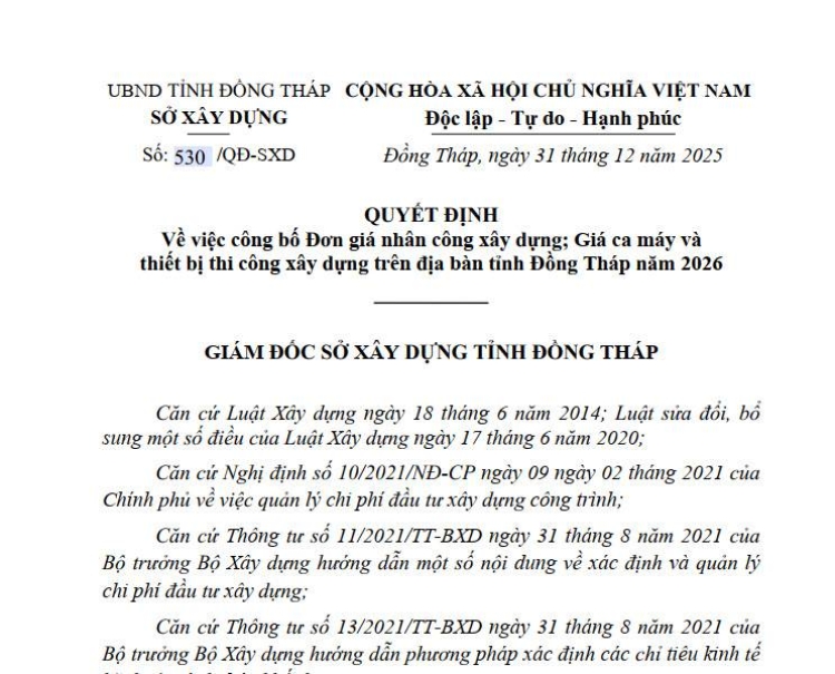 Đồng Tháp: Quyết định 530/QĐ-SXD Công bố Đơn giá nhân công, giá ca máy năm 2026