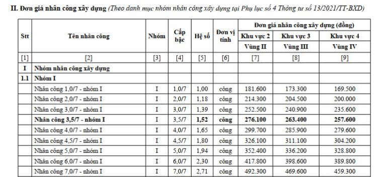 Ban hành kèm theo là phụ lục giá nhân công gồm 3 vùng: