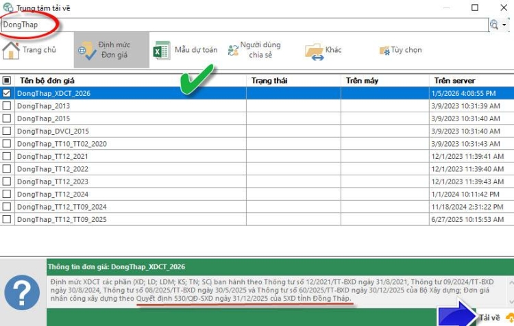 - Hiện tại [DỰ TOÁN BNSC] đã cập nhật dữ liệu nội dung đơn giá nói trên, Khách hàng tải dữ liệu DongThap_XDCT_2026 trực tiếp trên phần mềm [TẢI DỮ LIỆU TỪ MÁY CHỦ] để sử dụng.