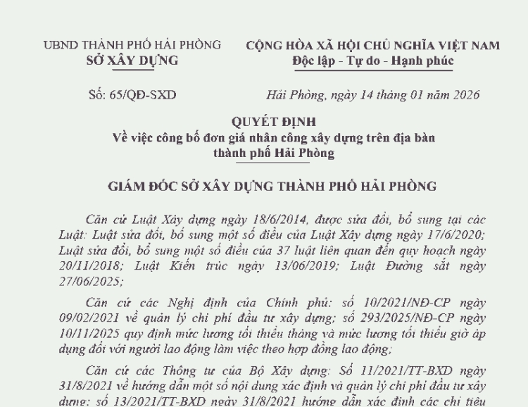 Ngày 14/01/2026, Sở Xây dựng thành phố Hải Phòng đã ký ban hành các Quyết định 65/QĐ-SXD và Quyết định 66/QĐ-SXD về việc công bố đơn giá nhân công xây dựng, Giá ca máy và thiết bị thi công xây dựng địa bàn thành phố Hải Phòng. Theo đó: