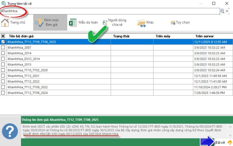 Hiện tại [DỰ TOÁN BNSC] đã cập nhật và đăng tải sever dữ liệu các đơn giá nói trên, Quý khách hàng tải dữ liệu KhanhHoa_TT12_TT09_TT08_2025 trực tiếp trên phần mềm [TẢI DỮ LIỆU TỪ MÁY CHỦ] để sử dụng.