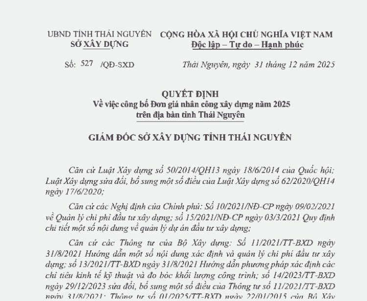 Ngày 31/12/2025, Sở Xây dựng tỉnh Thái Nguyên đã ký ban hành các Quyết định 527/QĐ-SXD và Quyết định 534/QĐ-SXD về việc công bố đơn giá nhân công xây dựng, Giá ca máy và thiết bị thi công xây dựng năm 2025 trên địa bàn tỉnh Thái Nguyên. Theo đó: