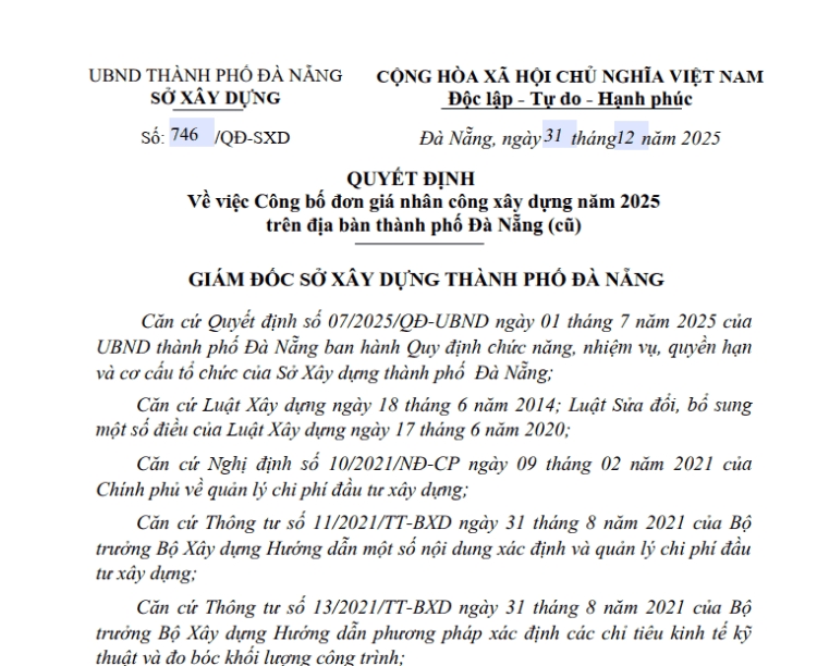 Ngày 31/12/2025, Sở Xây dựng thành phố Đà Nẵng đã ký ban hành các Quyết định 746/QĐ-SXD và 747/QĐ-SXD về việc công bố đơn giá nhân công xây dựng, Giá ca máy và thiết bị thi công xây dựng năm 2025 trên địa bàn thành phố Đà Nẵng (cũ). Theo đó: