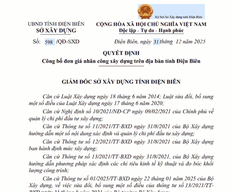 Ngày 31/12/2025, Sở Xây dựng tỉnh Điện Biên đã ký ban hành các Quyết định 598/QĐ-SXD và 599/QĐ-SXD về việc công bố đơn giá nhân công xây dựng, Giá ca máy và thiết bị thi công xây dựng địa bàn tỉnh Điện Biên. Theo đó:
