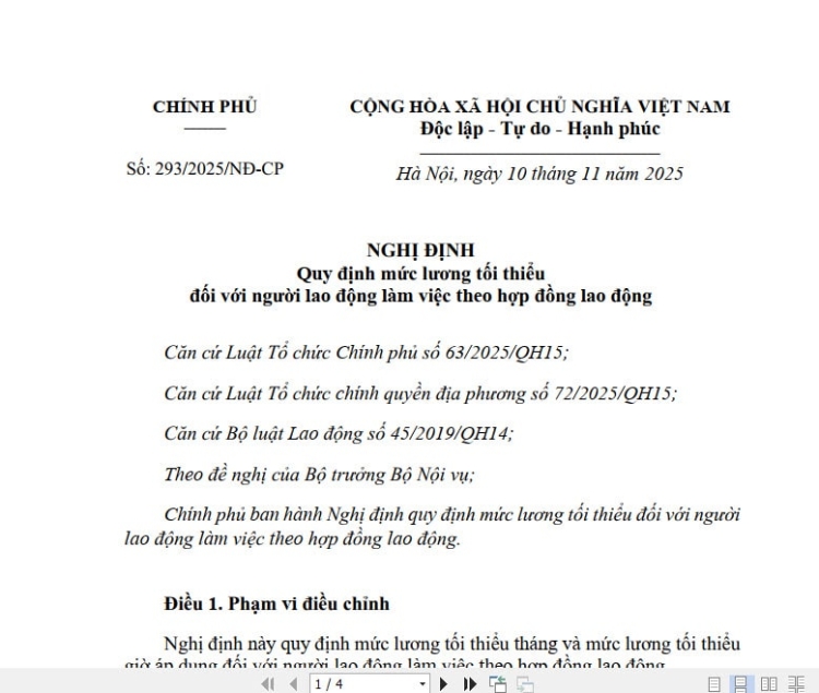 Ngày 10/11/2025, Chính phủ ban hành Nghị định số 293/2025/NĐ-CP quy định mức lương tối thiểu đối với người lao động làm việc theo hợp đồng lao động, có hiệu lực từ ngày 01/01/2026, thay thế Nghị định số 74/2024/NĐ-CP.